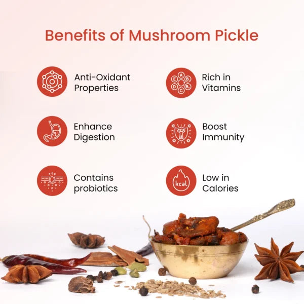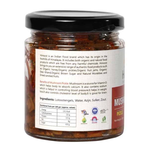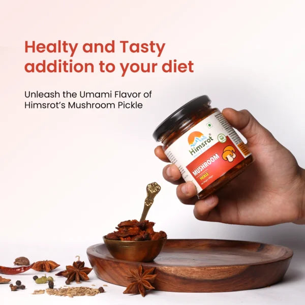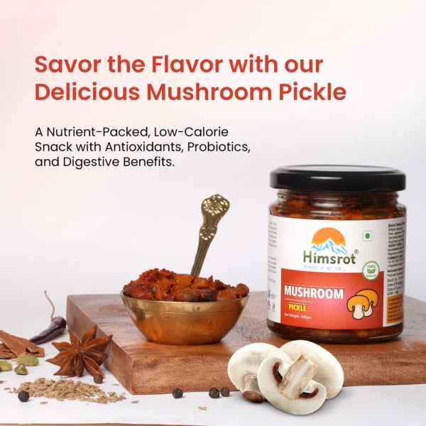 Mushroom Pickle Achar is homemade using naturally grown farm fresh mushrooms and spices for a perfect traditional and authentic taste. It's an excellent source of natural nutrients, combines delicious flavors, and creates the perfect zest for your meals. \nMushroom Achar's spicy and tangy flavors add richness to everyday meals like rice, paratha, idli, khichdi, upma, etc. These mushroom Achar Pickles aromas are prepared with Himalayan pink salt to ensure the true taste of the Himalayas. More information about Mushroom Achar
